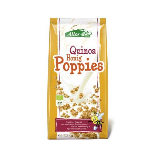 Allos 쿠이노아 허니 파피스 200g Allos Quinoa-Honig-Poppies bio 200g 퀴노아로 만든 달콤한 시리얼입니다. 우유에 말아 드세요. Besonders lecker kombinieren Sie die knusprigen Allos Quinoa-Honig-Poppies mit Joghurt, Milch, frischen Früchten oder Müsli. Oder knabbern Sie die Poppies einfach pur als Snack-Genuß für zwischendurch. Allos Quinoa Honig Poppies sind nur mit Honig und Agavendicksaft gesüßt.